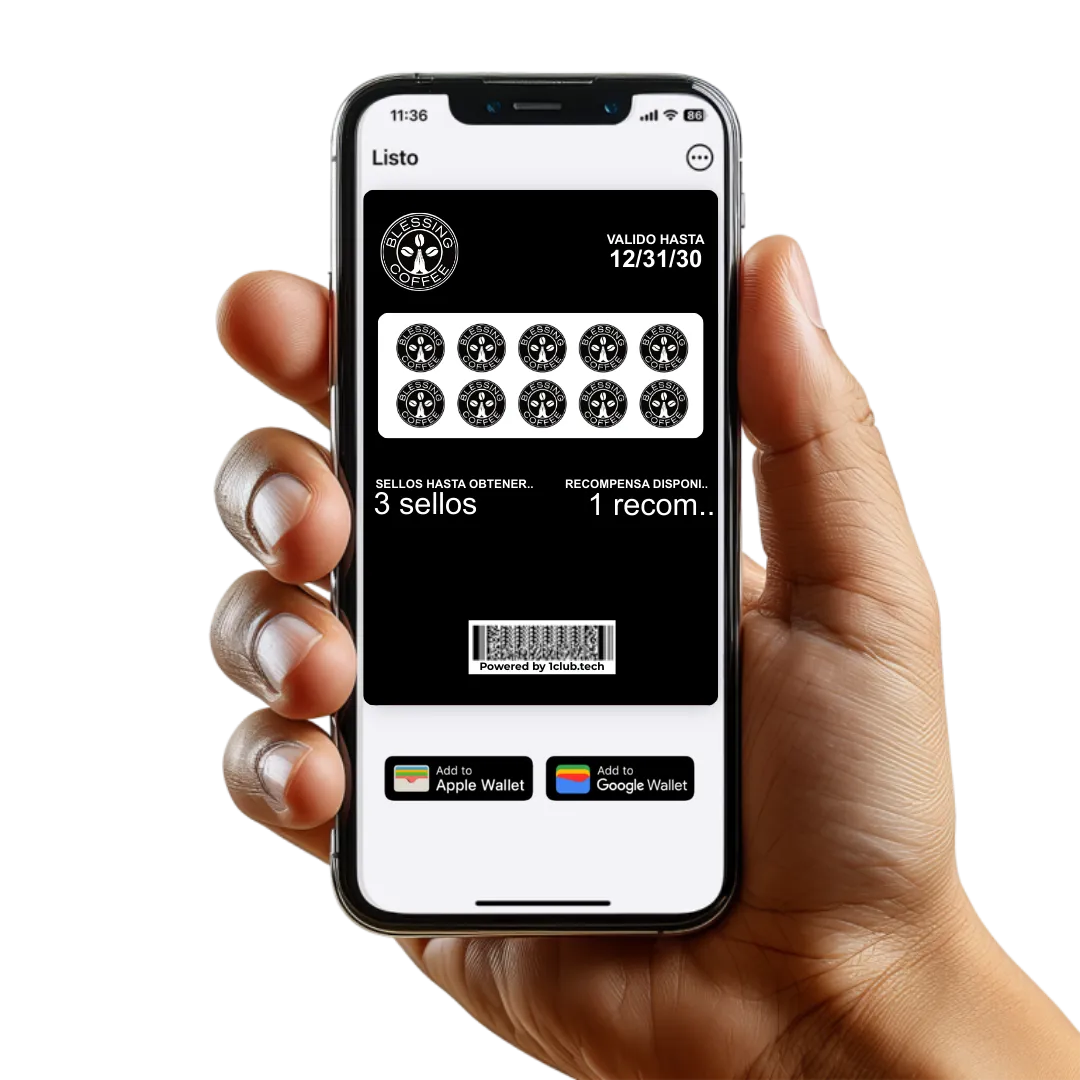 Las Tarjetas Digitales de Lealtad de 1Club son programas de recompensas que viven en el celular del cliente (Apple Wallet o Google Wallet), sin necesidad de apps ni plásticos físicos.